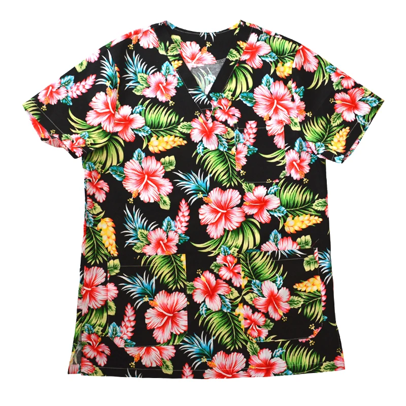12% OFF!! Women's V Neck Pure Cotton Flower Printing Scrubs TOP Short Sleeve Medical Uniforms Cute only $14.96