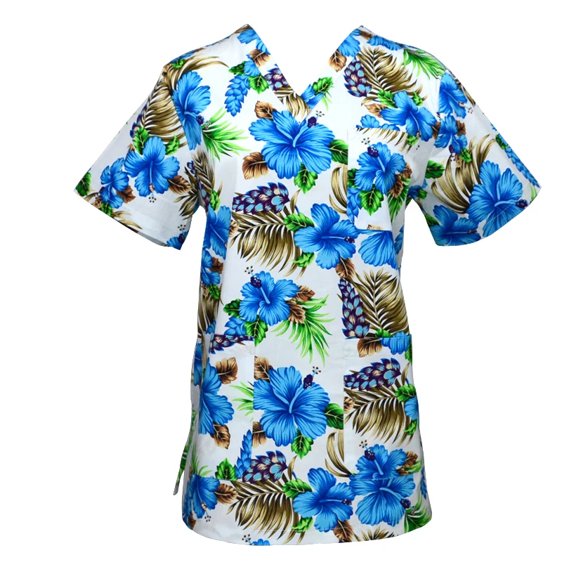 Women's V Neck Pure Cotton Flower Printing Scrubs TOP Short Sleeve Medical Uniforms Cute