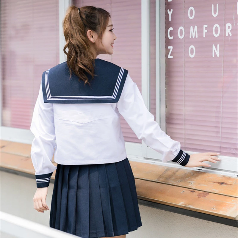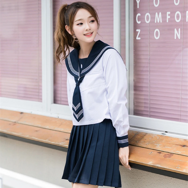 UPHYD 2019 Japan High School Uniform For Girls Chorus JK uniforms Short Sleeve Shirt and Navy Blue Pleated Skirt Sailor Cosplay