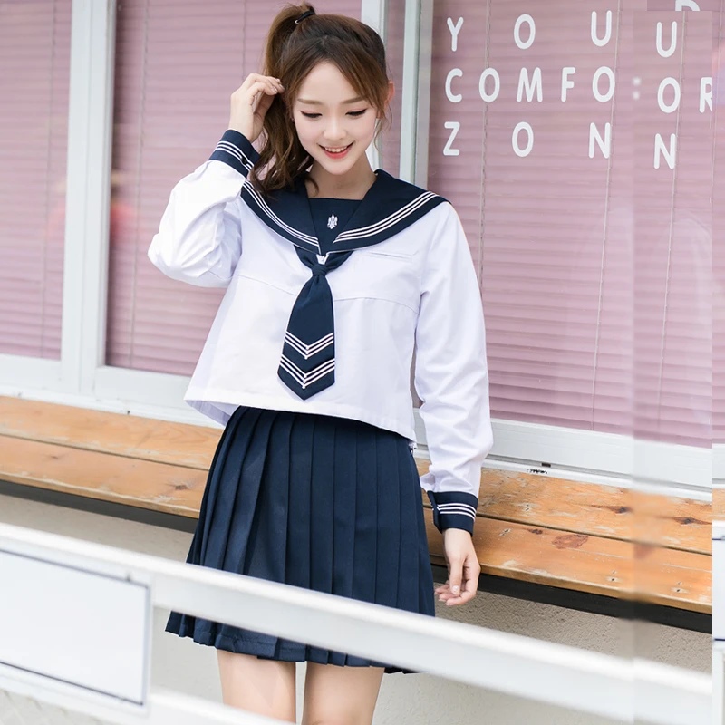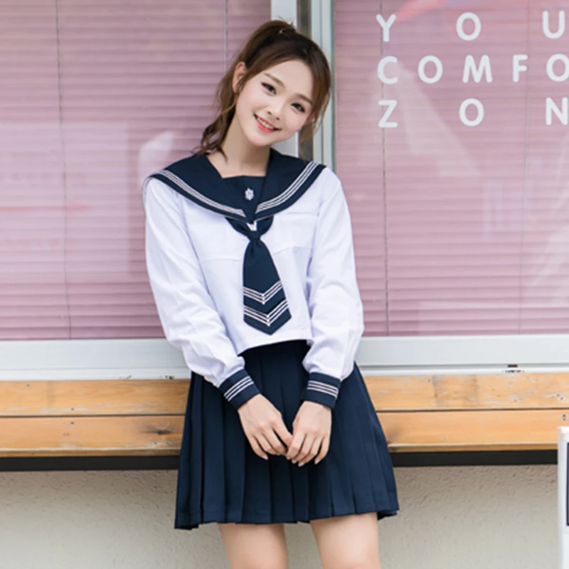 15% OFF!! UPHYD 2019 Japan High School Uniform For Girls Chorus JK uniforms Short Sleeve Shirt and Navy Blue Pleated Skirt Sailor Cosplay
