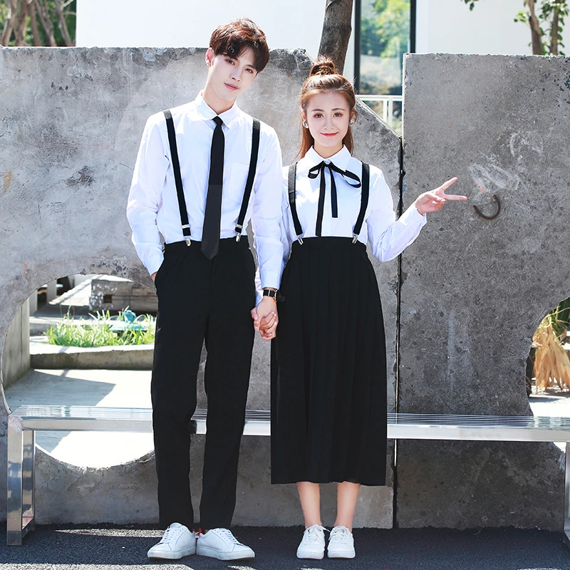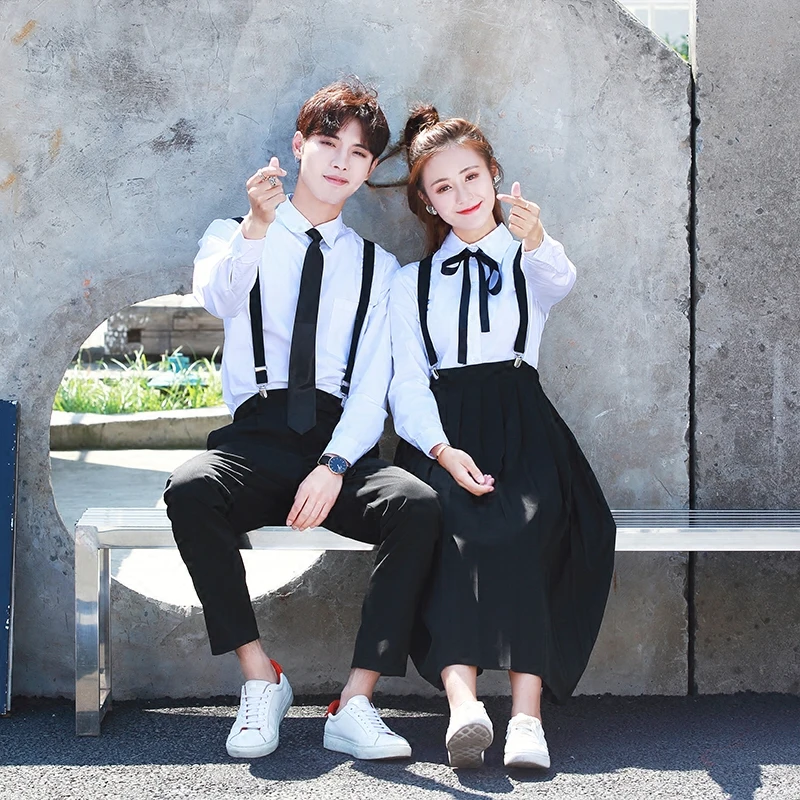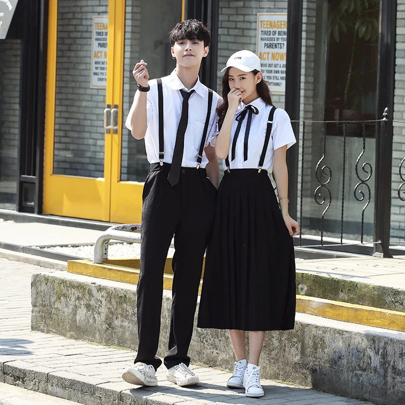 Korean School Uniform Girls Jk Navy Sailor Suit boy Japanese School Uniform Cotton White shirt +Straps Skirt for Summer autumn