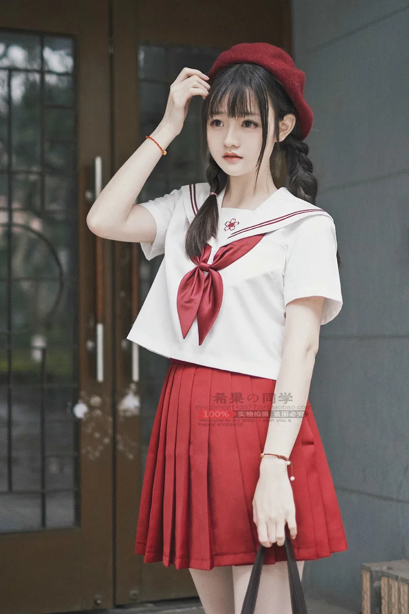OFF!! Japanese Girls Red JK Sailor Suit Cosplay School Uniforms Short Sleeve T Shirt Preppy Style College Skirt Female Costume Set