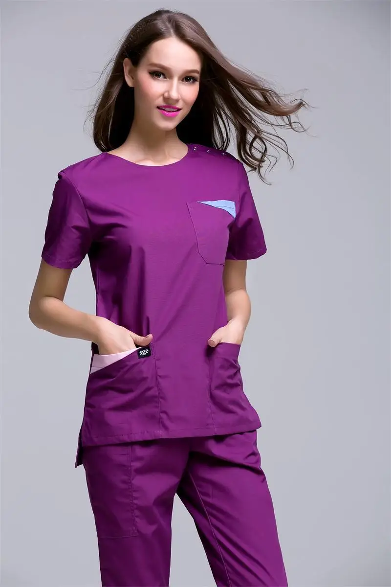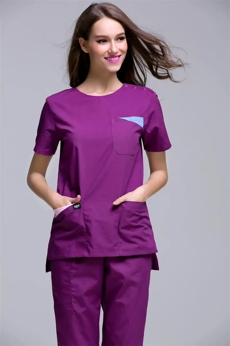 Wholesale Korea style women's summer short sleeve open shoulder round neck hospital surgical or medical scrub clothes sets uniforms