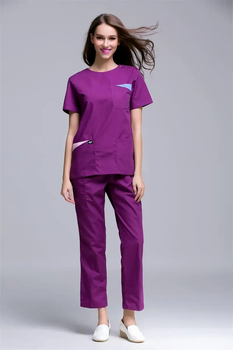 Korea style women's summer short sleeve open shoulder round neck hospital surgical or medical scrub clothes sets uniforms